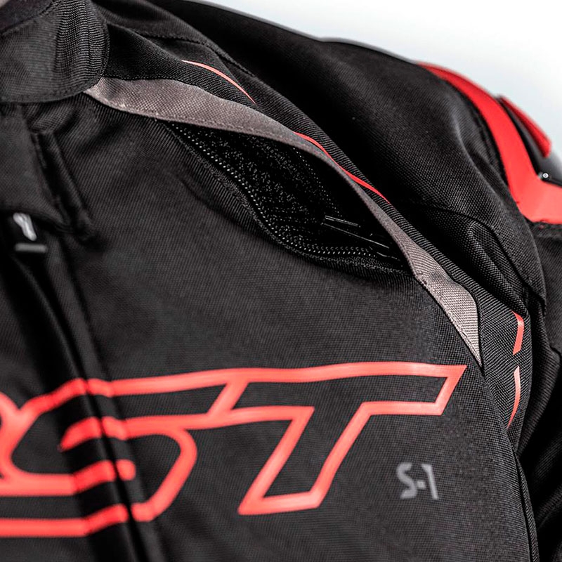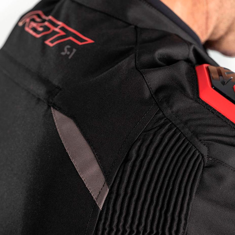 Chaqueta textil RST S1 Negro / Gris / Rojo. De aspecto deportivo a la vez que agresivo, la chaqueta RST S1 ha sido diseñada para ofrecer confort, seguridad y versatilidad en el día a día. Confeccionada con tejido muy resistente Maxtex, dispone de forro impermeable SinAqua, forro térmico extraíble y sistema de ventilación para una protección total contra los elementos. Incorpora paneles elásticos detrás de codos y brazos para mayor movilidad y diferentes ajustes en puños, mangas y cintura para un ajuste personalizado. La chaqueta RST S1 está equipada con protectores interiores CE Nivel 1 en codos y hombros pero además dispone de otros protectores exteriores de PU moldeado para una resistencia adicional a los impactos.