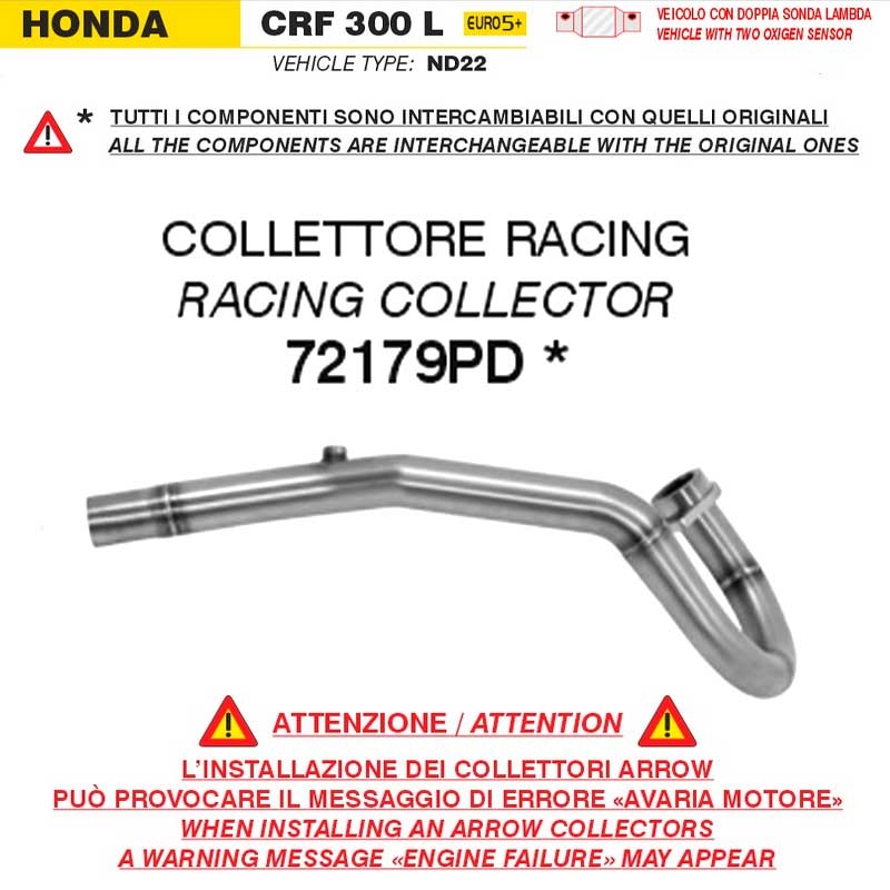 Colector escape Arrow 72179PD Honda CRF 300 L 2021. Colector Arrow 72179PD específicamente diseñado para la nueva Honda CRF 300 L 2021. El colector racing Arrow 72179PD no está homologado y está fabricado en TITANIO muy ligero y durable.