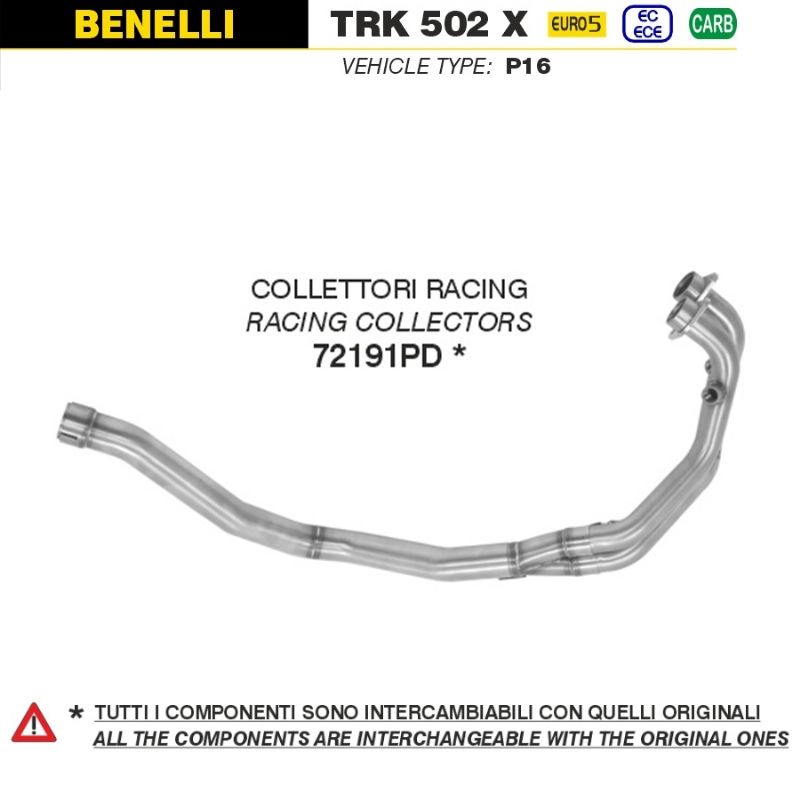 Colectores escape racing Arrow 72191PD Benelli TRK 502 X 2021-2023. Kit colectores racing no homologados Arrow 72191PD para Benelli TRK 502 X 2021-2023. Fabricados en acero muy ligero y duradero. Estos colectores son permutables con el original.