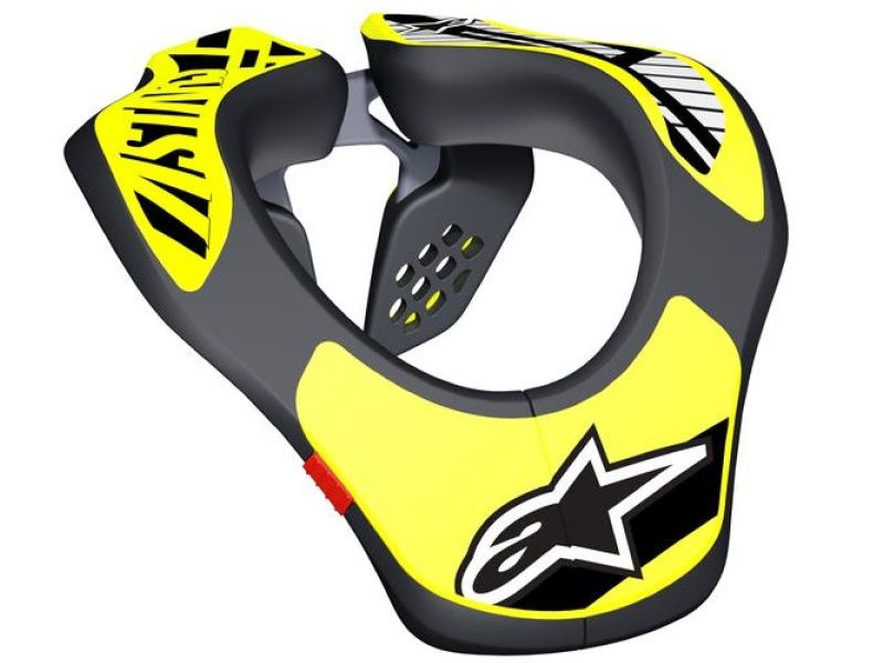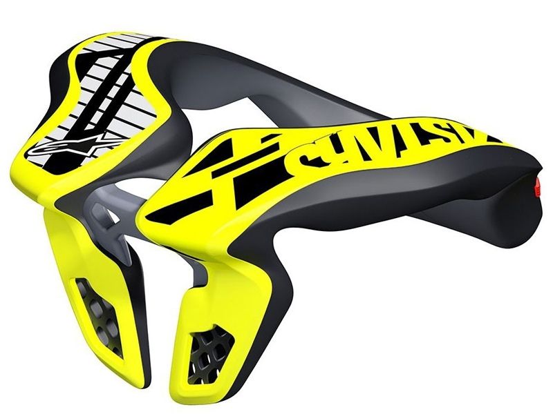 Collarín Alpinestars Neck Support Junior Negro / Amarillo Fluo. El collarín Alpinestars Neck Support Junior disminuye la energía de un fuerte impacto para evitar daños en el cuello y la columna vertebral. Su diseño es especial para poder adaptarse sin ofrecer molestias a jóvenes pilotos de 8 a 14 años. Su tamaño reducido y peso ligero combina perfectamente con un diseño muy anatómico, perfecto para integrarse con el peto A-5 S Junior de Alpinestars.