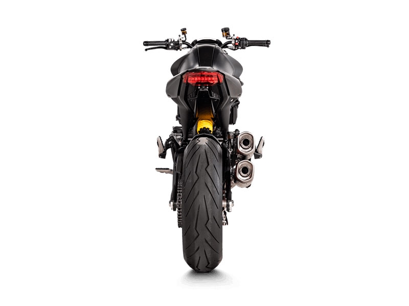 El peso se reduce en 3,8 kg, lo que supone un ahorro del 80 % frente a la versión de serie. Desarrollado para su uso en circuitos cerrados y pistas de carreras únicamente, se recomienda reasignar la ECU para obtener el rendimiento óptimo de este accesorio derivado de las carreras. La instalación del tubo de enlace opcional (SS) invalida la aprobación de tipo EC/ECE de la línea Slip-On (titanio).