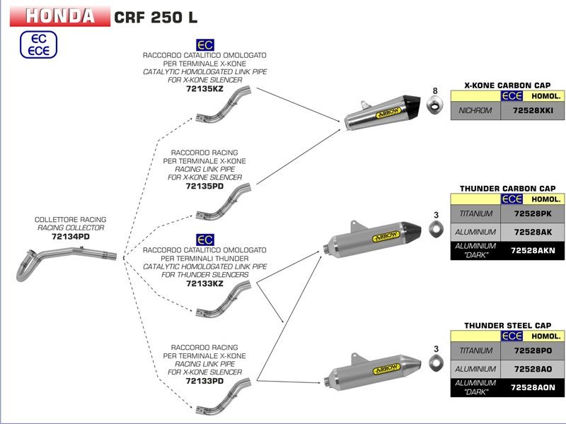 Debido a la complejidad de los productos Arrow, es muy importante verificar con la web del fabricante si es necesario o no el conector o colector para el montaje del silencioso. Debes saber que una línea continua en el esquema indica que este artículo es obligado. Por el contrario si la línea es discontinua, el montaje será opcional.