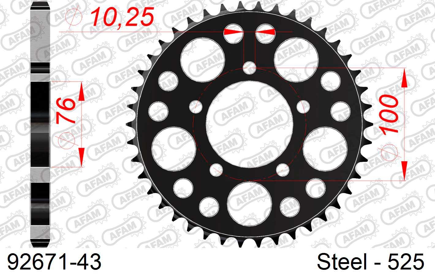 Corona AFAM 92671-43. Las coronas de transmisión para moto AFAM son reconocidas por su diseño innovador y su excelente rendimiento. Fabricadas con un alto nivel de precisión y utilizando materiales de la mejor calidad, estas coronas son elegidas por motociclistas de todo el mundo debido a su durabilidad y resistencia superior.