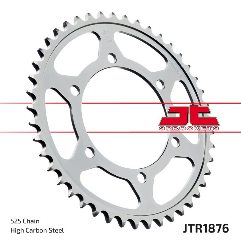 Corona Jt Sprockets JTR1876.50. La corona Jt Sprockets Jt Sprockets JTR1876.50 dientes posee la mejor calidad y durabilidad con la mejor relación calidad y precio disponible en el mercado. Fabricada en aleación ultra-durable de acero alto de carbono C49, la corona JT Sprockets garantiza un acabado inmejorable. Las coronas y piñones Jt Sprockets para kits de transmisión de moto, son utilizados por fabricantes como Honda, Yamaha, Kawasaki, etc en sus equipaciones de serie.