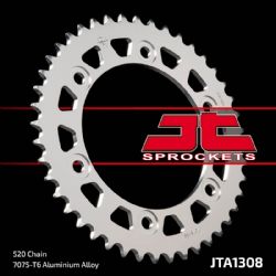 Corona Jt sprockets JTA1308 42. La corona Jt sprockets JTA1308 42 posee la mejor calidad y durabilidad con la mejor relación calidad y precio disponible en el mercado. Fabricada en aleación 7075-T6 de aluminio, esta versión de corona Jt Sprockets, disminuye el peso respecto a la corona de acero con las siglas JTR y cuenta con algo menos de durabilidad. Todo el proceso se realiza mediante computadora CNC y equipo de control de corte de metal, proporcionado un acabado inmejorable. Las coronas y piñones Jt Sprockets para kits de transmisión de moto, son utilizados por fabricantes como Honda, Yamaha, Kawasaki, etc en sus equipaciones de serie.