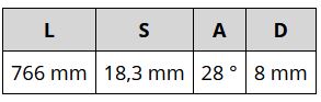 | 766 mm | 18,3 mm | 28 ° | 8 mm |