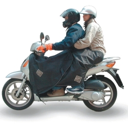Manta cubrepiernas Tucano Urbano R091 (pasajero). Funda exterior impermeable de Nylon resistente. Interior forrado para mayor sensación de calor. Costuras termoselladas. Sistema hinchable anti-flaneo S.G.A.S. Sistema antirrobo (anillo metálico) sólo disponible en modelos sin tornillos. Amplio bolsillo portaobjectos impermeable. Funda de asiento incorporada. Cinta de seguridad reflectante.