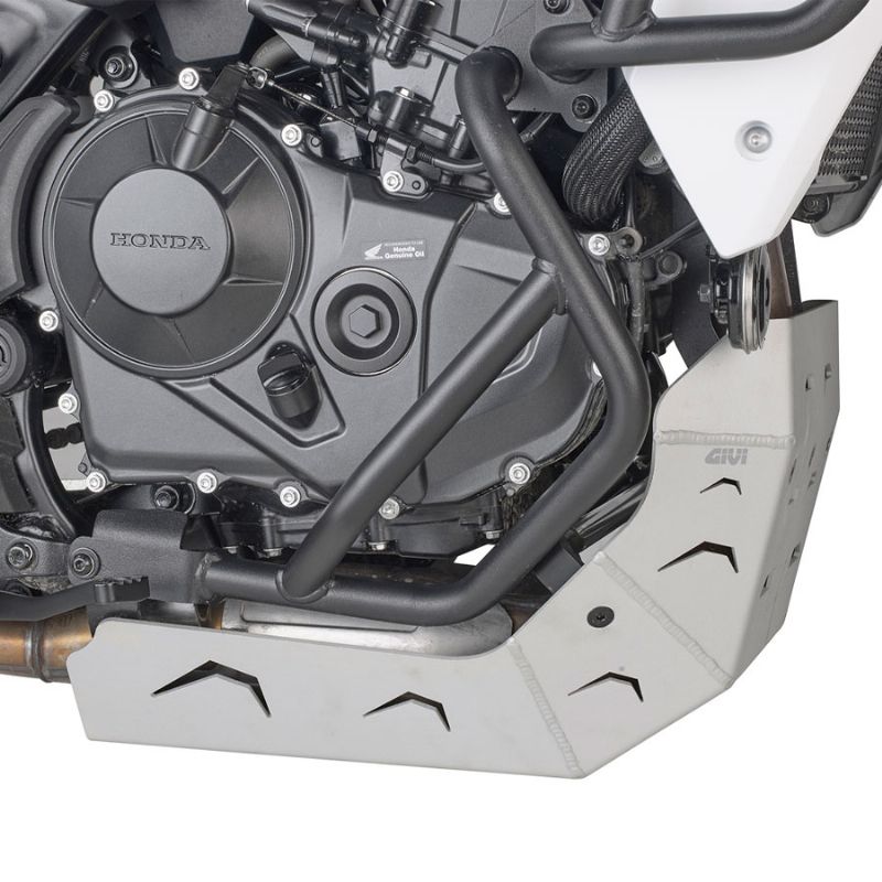 Cubrecarter Givi RP1201 Honda XL 750 Transalp 2023. El Cubrecárter Givi RP1201 para la Honda XL 750 Transalp 2023 es una pieza de protección robusta y diseñada meticulosamente, específica para este modelo de motocicleta. Fabricado en aluminio satinado y anodizado, este cubrecárter no solo aporta una capa adicional de seguridad al motor y a los componentes inferiores frente a impactos y escombros del camino, sino que también añade un toque estético distintivo a la moto. Con un espesor de 4 mm, ofrece una resistencia excepcional sin añadir peso innecesario, manteniendo la agilidad y el rendimiento de la Transalp.