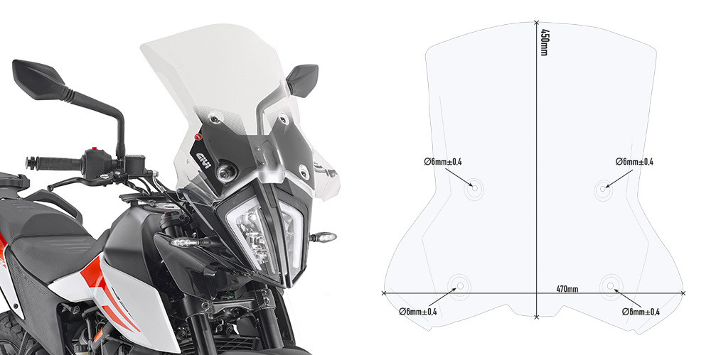 Cúpula Givi 7710DT KTM 790 Adventure 2019 / 390 Adventure 2020. Nueva cúpula Givi 7710DT transparente, específica para la KTM 790 Adventure 2019 y KTM 790 Adventure R 2019 y que gracias a su excelente diseño, aporta un plus de protección contra el viento. La cúpula Givi 7710DT está realizada con materiales de gran resistencia y durabilidad. Medidas: 45 x 47 cms (hxa). Imprescindible para su montaje combinar con los anclajes D7710KIT o D7711KIT (se vende por separado).