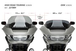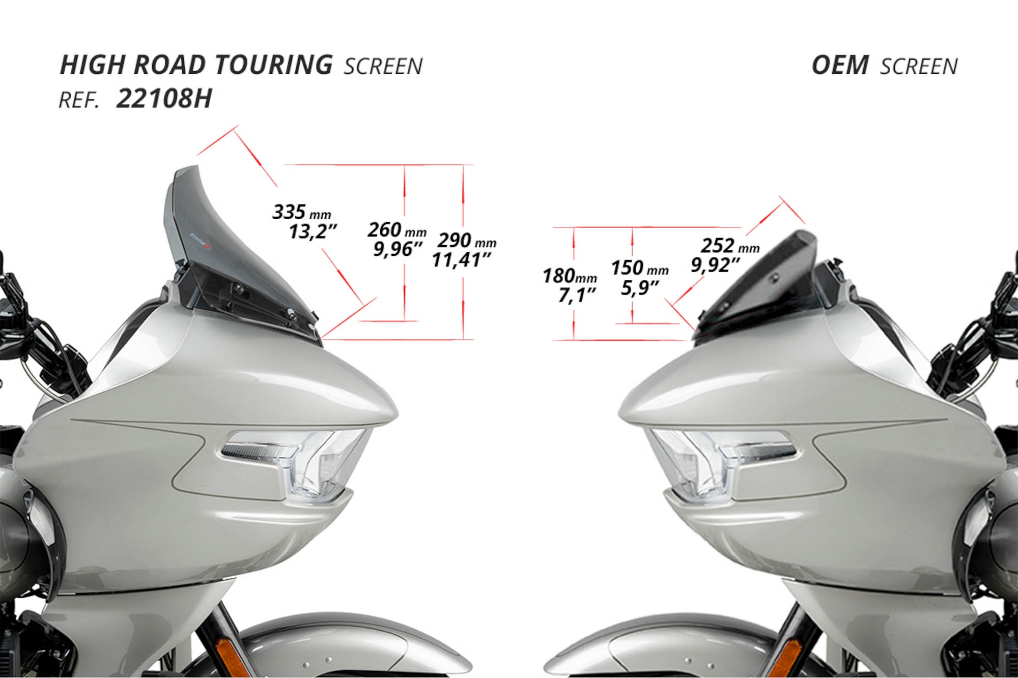 La versión Touring de la High Road se distingue por su mayor altura —110 mm más que la original—, lo que mejora la protección sin comprometer la estética. Además, está disponible en tres acabados: transparente (REF. 22108W), ahumado claro (REF. 22108H) y ahumado oscuro (REF. 22108F), para adaptarse al estilo de cada motocicleta.