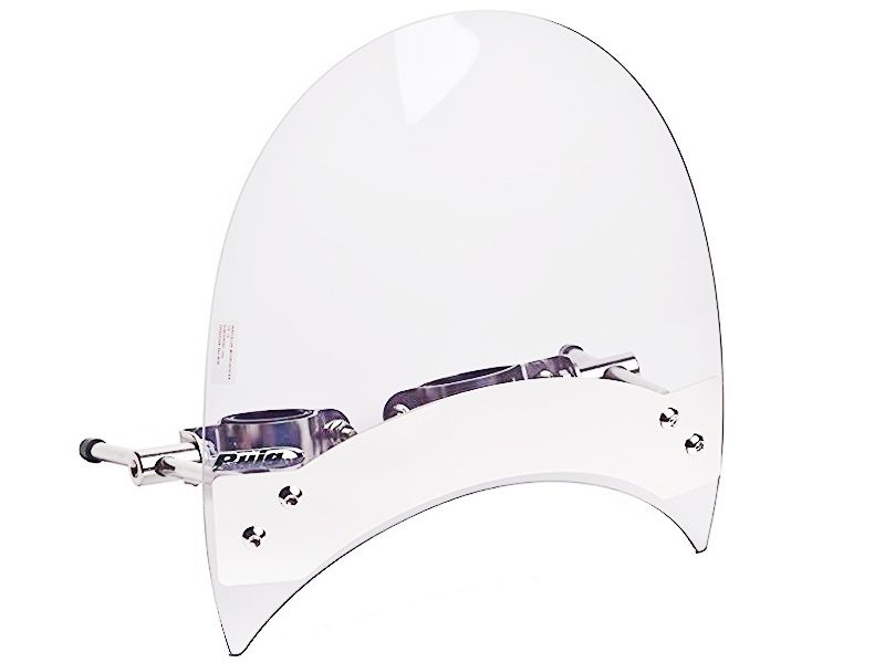 Carenabris Puig 0444W Roadster transparente. Cúpula universal Puig 0444W modelo roadster, ideal para tu moto custom. Realizada con metacrilato de alto impacto y acero inoxidable cromado. Al anclaje a la moto se realiza con 2 puntos de fijación.