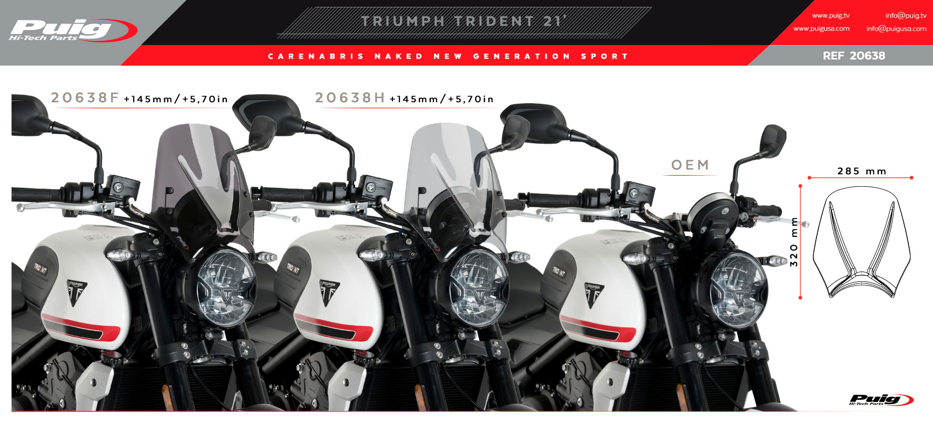 Cúpula Puig 20638H Naked New Generation Sport Triumph Trident 660 2021. Parabrisas Puig 20618R Naked New Generation específica para la nueva Triumph Trident 660 2021 y que gracias a su metracrilato de alto impacto con grosor de 3 mm, ofrece una gran resistencia y excelente fijación a la moto. Esta cúpula ha sido perfectamente estudiada para mejorar la protección del motorista contra el viento. La cúpula Puig Naked New Generation Sport se caracteriza por sus acabados de gran calidad. El montaje de la cúpula es una tarea sencilla y se ajusta a la perfección a la moto. Para facilitar el montaje, Puig sirve junto al carenabris con las correspondientes instrucciones. Homologación ABE 3818 y TÜV. Homologación ABE 3818 y TÜV.