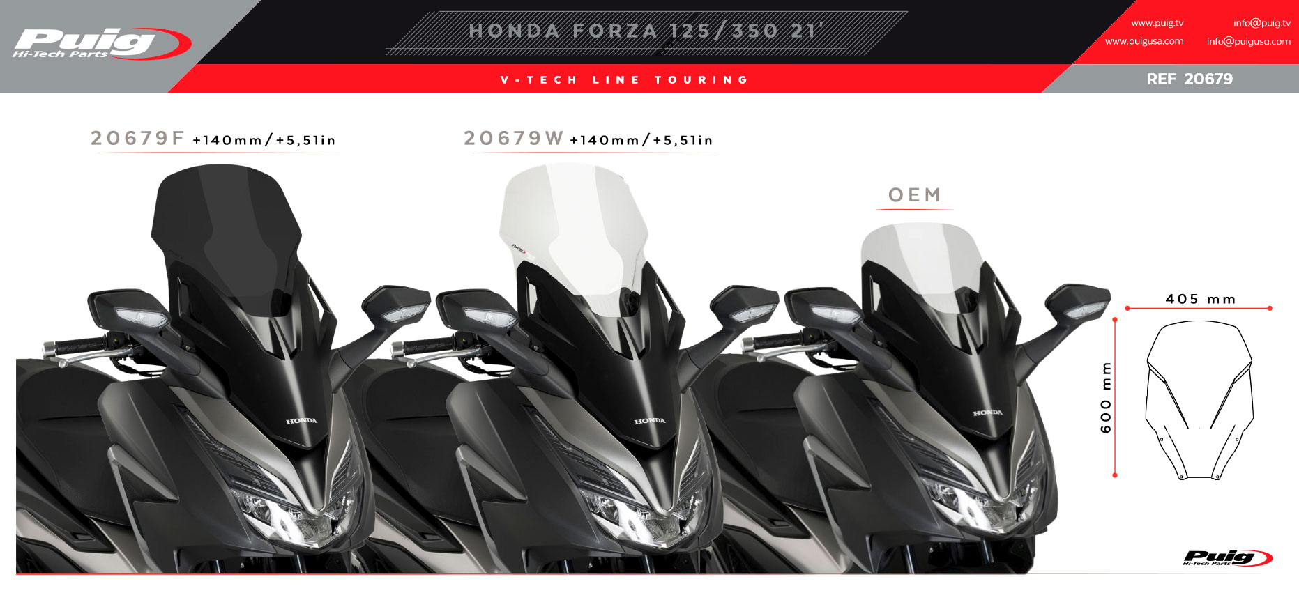 Cúpula Puig 20679H Touring Honda Forza 125 / 350 2021. Su diseño es específico para la nueva Honda Forza 125 y Forza 350 2021 y mejora notablemente la aerodinámica y la disminución del efecto del viento sobre el casco. De la resistencia se encarga un acrílico de alto impacto con 4 mm de grosor (según modelo) que garantiza la máxima durabilidad y acabados impecables. Para facilitar el montaje, Puig sirve junto al carenabris con las correspondientes instrucciones. Homologación ABE 3818 y TÜV. Homologación ABE 3818 y TÜV.