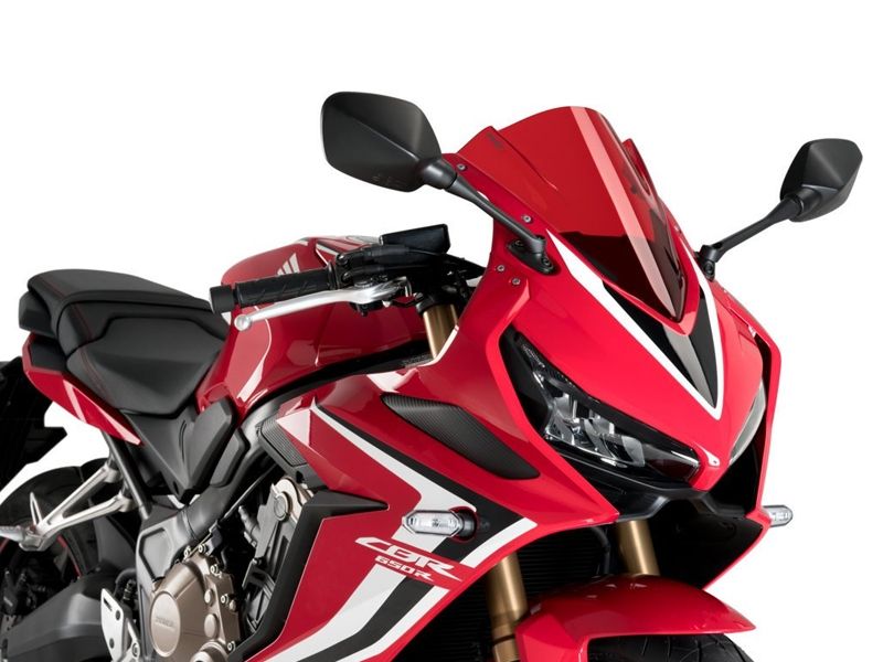 Cúpula Puig 3568R Honda CBR650R 2019 Racing roja. La cúpula Puig 3568 Racing derivada directamente de la experiencia adquirida en competición. Su diseño es específico para la nueva Honda CBR650R 2019 y gracias a su doble altura, mejora notablemente la aerodinámica y la disminución del efecto del viento sobre el casco. De la resistencia se encarga un acrílico de alto impacto con 3 mm de grosor que garantiza la máxima durabilidad y acabados impecables. Se ha comprobado en el tunel del viento, que las cúpulas racing z-racing mejoran el coeficiente aerodinámico en un 12,7% de media. Medidas: (Altura X Anchura): 335 X 285 mm. Posee la homologación ABE 39524 y TÜV.