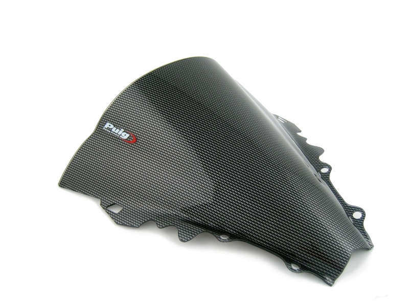 Carenabris Puig Racing 4059C Simil Carbono. Cúpula derivada de la competición y específica para Yamaha R6 2006/ 2007. Las cúpulas Puig Z-Racing estudiadas en el túnel del viento, mejoran el coeficiente aerodinámico y la protección contra el viento en un 12,7% de media. Su doble altura disminuye el efecto del aire sobre el casco. Realizada en acrílico de alto impacto de 3 mm, resistente y duradero. Perfil redondeado a 3 mm en los modelos desde el 2004, cumpliendo con la normativa del TÜV alemán. No se requiere ribete. .