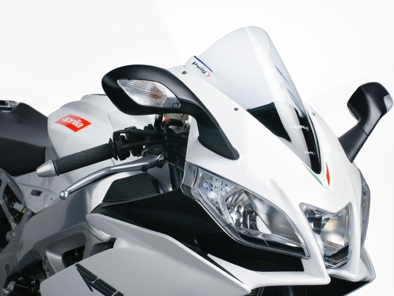 Cúpula Puig Racing 4945W Transparente. Cúpula derivada de la competición y específica para Aprilia RS4 50, RS4 125 y RSV4. Las cúpulas Puig Z-Racing estudiadas en el túnel del viento, mejoran el coeficiente aerodinámico y la protección contra el viento en un 12,7% de media. Su doble altura disminuye el efecto del aire sobre el casco. Realizada en acrílico de alto impacto de 3 mm, resistente y duradero. Perfil redondeado a 3 mm en los modelos desde el 2004, cumpliendo con la normativa del TÜV alemán. No se requiere ribete.