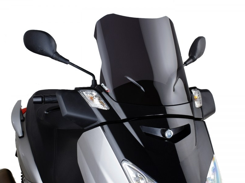 Carenabris Puig 5015F Ahumado Oscuro. Cúpula Puig V-Tech Line Touring para Yamaha X-max 125/ 250 2006/ 2009. El diseño V-Tech ha sido desarrollado en el túnel del viento para mejorar la estabilidad y penetración aerodinámica de la cúpula original. La forma angulosa en su parte central y lateral facilitan la canalización del aire redirigiéndolo a ambos lados del piloto, minimizando turbulencias y manteniendo el carácter radical de la pieza. Los carenabrises V-Tech Touring son aquellos que la altura en mm es mayor respecto la cúpula original. Medidas (Altura x Anchura): 370 x 410 mm (20 mm más alta que la original).