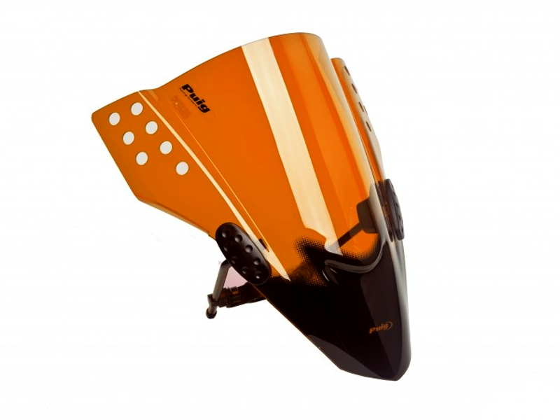 Carenabris universal Puig Rafale 5881T Naranja. Carenabris para motocicletas con faro trapezoidal. Anclaje con 2 puntos de sujeción. Realizado con metacrilato de 3 mm. Dispone de la homologación TÜV geprüft ABE 38007 - WS. Medidas: 350 mm (ancho) x 355 mm (alto).