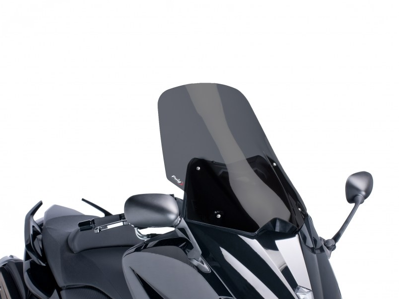 Carenabris Puig 6260F Ahumado Oscuro. Cúpula Puig V-Tech Line Touring para Yamaha T-max 2012/ 2015. El diseño V-Tech ha sido desarrollado en el túnel del viento para mejorar la estabilidad y penetración aerodinámica de la cúpula original. La forma angulosa en su parte central y lateral facilitan la canalización del aire redirigiéndolo a ambos lados del piloto, minimizando turbulencias y manteniendo el carácter radical de la pieza. Los carenabrises V-Tech Touring son aquellos que la altura en mm es mayor respecto la cúpula original. Medidas (Altura x Anchura): 590 x 425 mm (70 mm más alta que la original).