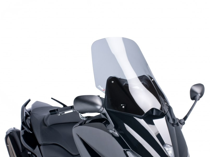 Carenabris Puig 6260H Ahumado. Cúpula Puig V-Tech Line Touring para Yamaha T-max 2012/ 2015. El diseño V-Tech ha sido desarrollado en el túnel del viento para mejorar la estabilidad y penetración aerodinámica de la cúpula original. La forma angulosa en su parte central y lateral facilitan la canalización del aire redirigiéndolo a ambos lados del piloto, minimizando turbulencias y manteniendo el carácter radical de la pieza. Los carenabrises V-Tech Touring son aquellos que la altura en mm es mayor respecto la cúpula original. Medidas (Altura x Anchura): 590 x 425 mm (70 mm más alta que la original).