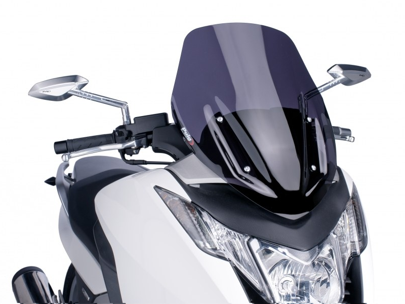 Carenabris Puig 6283F Ahumado Oscuro. Cúpula Puig V-Tech Line Sport para Honda Integra 700/750. El diseño V-Tech Sport ha sido desarrollado en el túnel del viento para mejorar la estabilidad y penetración aerodinámica de la cúpula original. La forma angulosa en su parte central y lateral facilitan la canalización del aire redirigiéndolo a ambos lados del piloto, minimizando turbulencias y manteniendo el carácter radical de la pieza. Los carenabrises Puig V-Tech Sport, son aquellos que la altura en mm es menor o igual respecto a la cúpula original. Medidas (Altura x Anchura): 515 x 450 mm (90 mm más baja que la original).