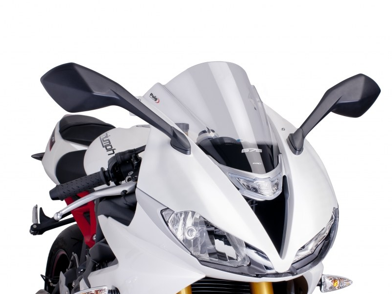 Carenabris Puig Racing 6498W Transparente. Cúpula derivada de la competición y específica para Triumph Daytona 675/ R 2013/ 2015. Las cúpulas Puig Z-Racing estudiadas en el túnel del viento, mejoran el coeficiente aerodinámico y la protección contra el viento en un 12,7% de media. Su doble altura disminuye el efecto del aire sobre el casco. Realizada en acrílico de alto impacto de 3 mm, resistente y duradero. Perfil redondeado a 3 mm en los modelos desde el 2004, cumpliendo con la normativa del TÜV alemán. No se requiere ribete. Medidas (Altura x Anchura): 400 x 280 mm.