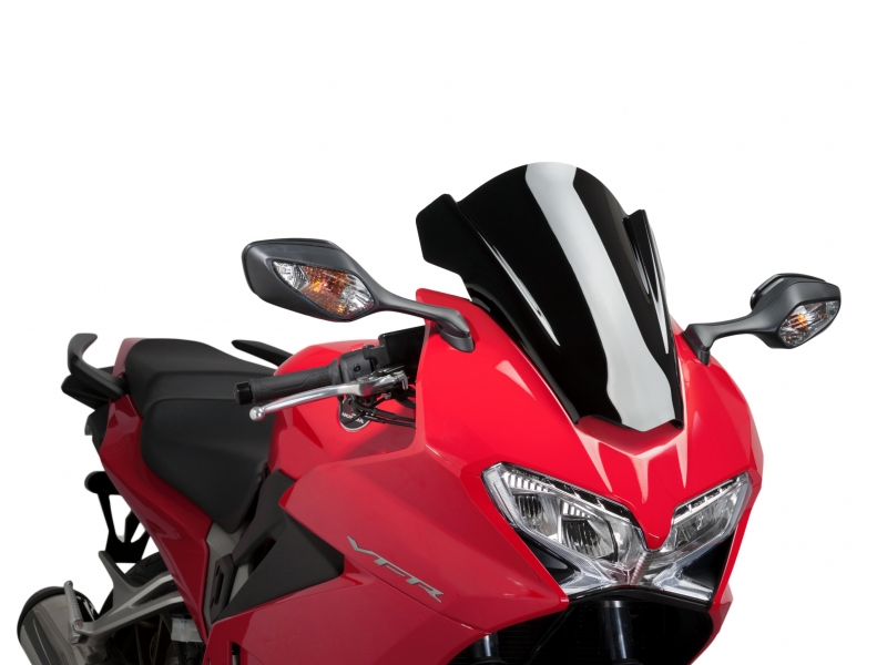 Carenabris Puig Racing 7598N Negro. Cúpula derivada de la competición y específica para Honda Vfr 800 f 2014/ 2015. Las cúpulas Puig Z-Racing estudiadas en el túnel del viento, mejoran el coeficiente aerodinámico y la protección contra el viento en un 12,7% de media. Su doble altura disminuye el efecto del aire sobre el casco. Realizada en acrílico de alto impacto de 3 mm, resistente y duradero. Perfil redondeado a 3 mm en los modelos desde el 2004, cumpliendo con la normativa del TÜV alemán. No se requiere ribete. Medidas (Altura x Anchura): 490 x 410 mm.