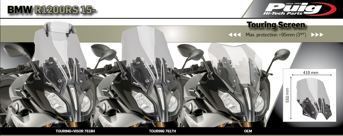 Carenabris Cúpula Puig 7617F Bmw R 1200 RS 2015 ahumada oscura. Cúpula Puig 7617F Touring desarrollada en el túnel del viento para mejorar la estabilidad y la penetración aerodinámica de la cúpula original. Realizada con materiales de alta calidad, la cúpula cúpula Puig 7617F Touring ofrece un diseño con mayor altura que la cúpula original y por tanto una mayor protección contra el viento. Medidas (Altura x Anchura): 550 x 410 mm. Homologación ABE 3818 y TÜV.