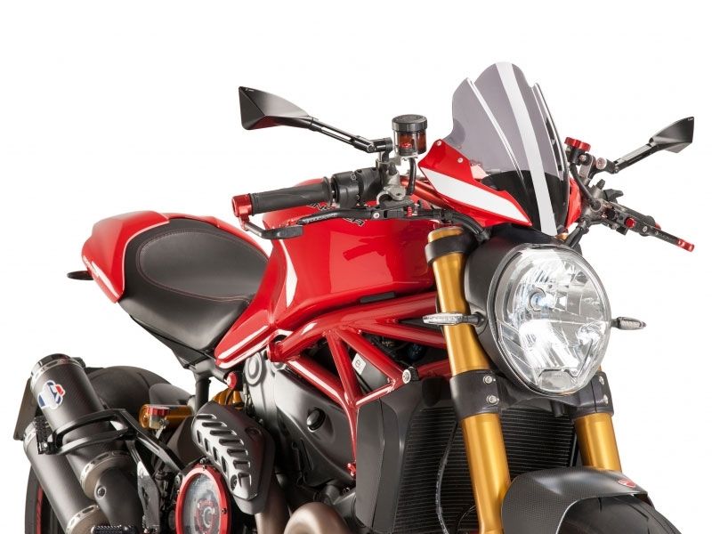 Carenabris moto cúpula Puig 8900H Ducati Monster 1200 R 2016 Touring ahumada clara. Cúpula Puig 8900H Naked New Generation específica para la Ducati Monster 1200 R y que gracias a su metracrilato de alto impacto con grosor de 3 mm, ofrece una gran resistencia y excelente fijación a la moto. Esta cúpula ha sido perfectamente estudiada para mejorar la protección del motorista contra el viento. La cúpula Puig 8900 se caracteriza por sus acabados de gran calidad.