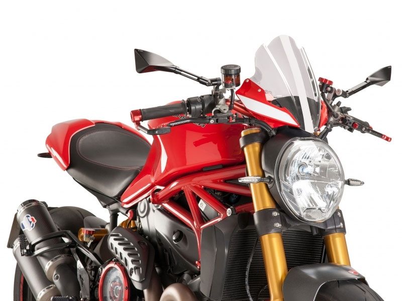 Carenabris moto cúpula Puig 8900W Ducati Monster 1200 R 2016 Touring transparente. Cúpula Puig 8900W Naked New Generation específica para la Ducati Monster 1200 R y que gracias a su metracrilato de alto impacto con grosor de 3 mm, ofrece una gran resistencia y excelente fijación a la moto. Esta cúpula ha sido perfectamente estudiada para mejorar la protección del motorista contra el viento. La cúpula Puig 8900 se caracteriza por sus acabados de gran calidad.