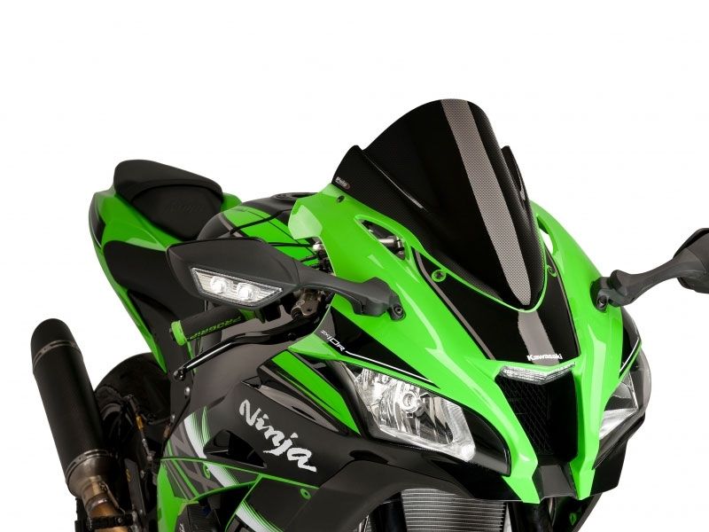 Carenabris Cúpula Puig Racing 8912C Kawasaki ZX-10R 2016 Símil Carbono. La cúpula Puig 8912C racing derivada directamente de la experiencia adquirida en competición. Su diseño es específico para la nueva Kawasaki ZX-10R 2016 y gracias a su doble altura, mejora notablemente la aerodinámica y la disminución del efecto del viento sobre el casco. De la resistencia se encarga un acrílico de alto impacto con 3 mm de grosor que garantiza la máxima durabilidad y acabados impecables. Se ha comprobado en el tunel del viento, que las cúpulas racing z-racing mejoran el coeficiente aerodinámico en un 12,7% de media. Max. protection +40mm (15/8”). Medidas cúpula Puig 8912C: 360 mm (Alto) x 320 (Ancho) mm.