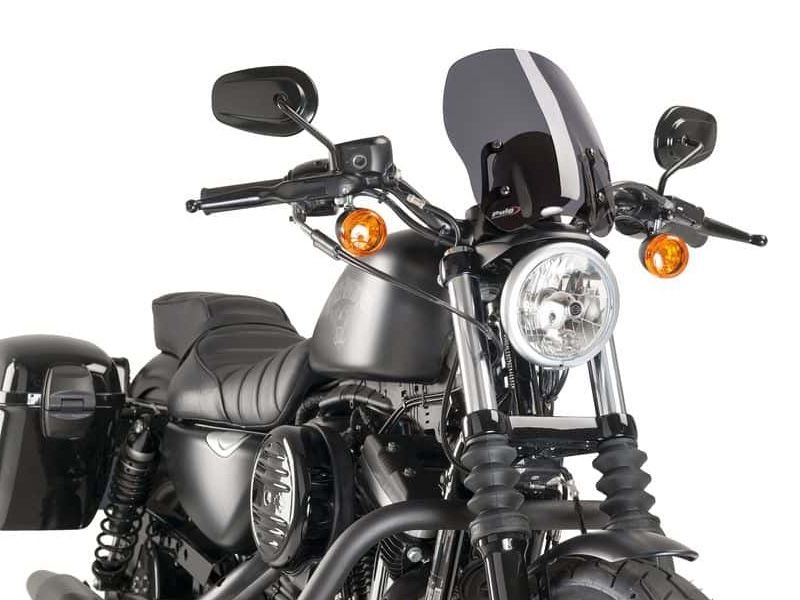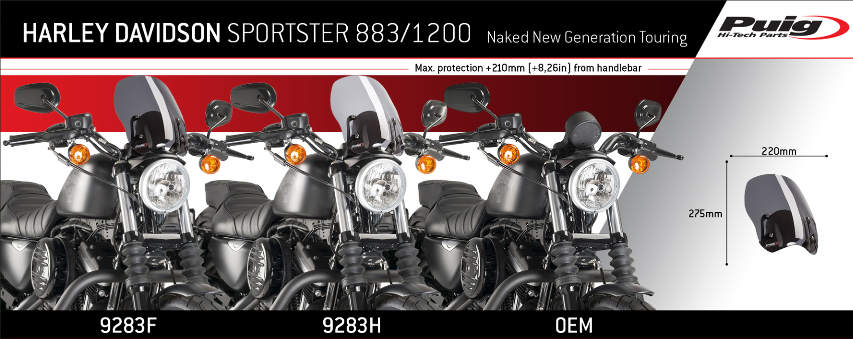 Cúpula Puig 9283F Harley Davidson Sportster 883/1200 Naked New Generation Touring ahumada oscura. Cúpula Puig 9283F Naked New Generation específica cada modelo de moto y que gracias a su metracrilato de alto impacto con grosor de 3 mm, ofrece una gran resistencia y excelente fijación a la moto. Esta cúpula ha sido perfectamente estudiada para mejorar la protección del motorista contra el viento. La cúpula Puig 9283 se caracteriza por sus acabados de gran calidad.