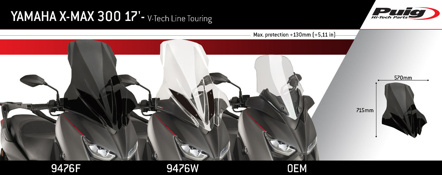 Carenabris Cúpula Puig 9476W Yamaha X-Max 300 2017 transparente. Cúpula Puig 9476W V-Tech Line Touring desarrollada en el túnel del viento para mejorar la estabilidad y la penetración aerodinámica de la cúpula original. Realizada con materiales de alta calidad, la cúpula cúpula Puig 9476W V-Tech Line Touring ofrece un diseño con mayor altura que la cúpula original y por tanto una mayor protección contra el viento. Medidas (Altura x Anchura): 715 x 570 mm (130 mm más baja que la original).