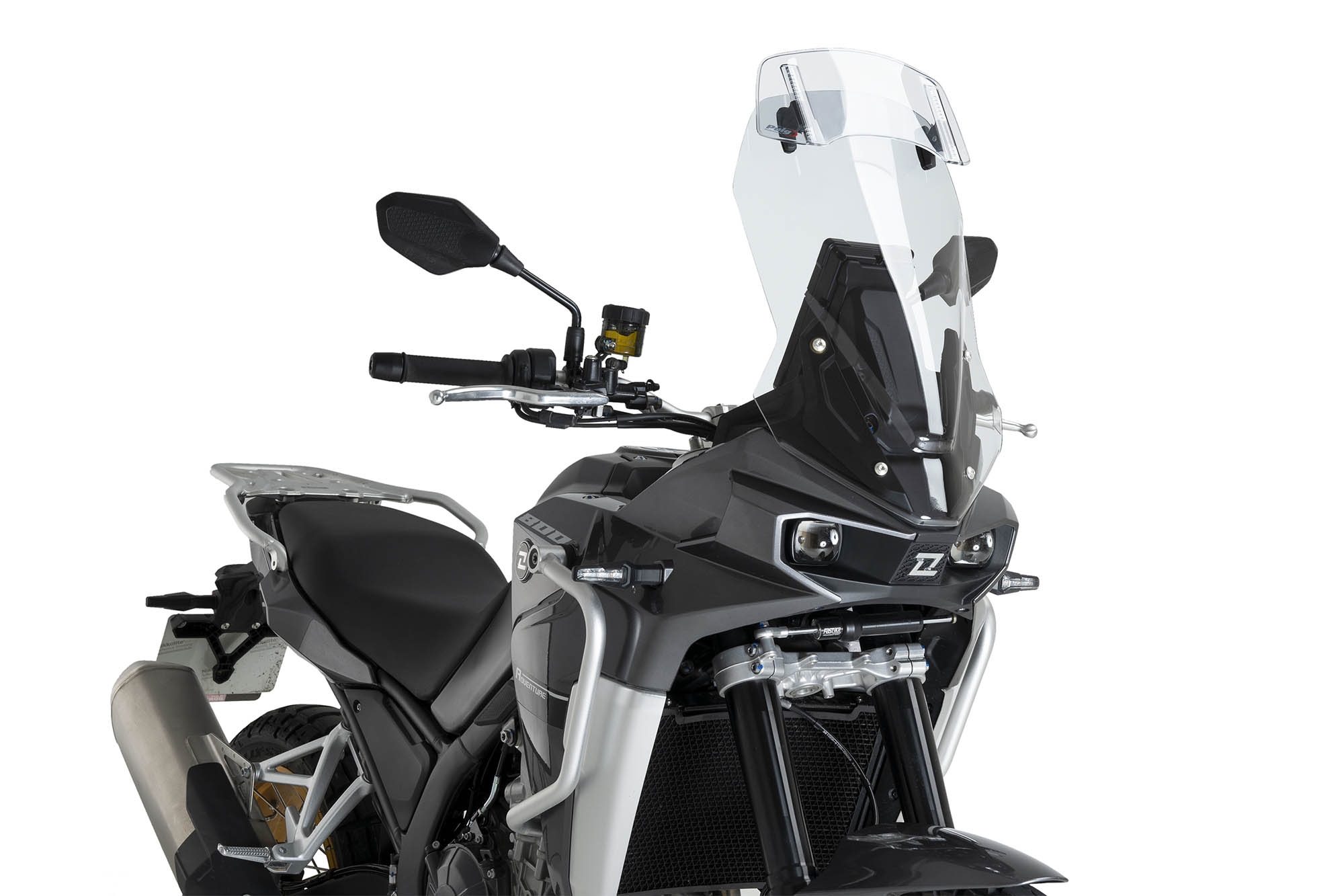 La cúpula Touring con visera Puig 22371 para Kove 800X PRO está disponible en acabado transparente y en acabado ahumado claro, dos opciones que encajan muy bien con la estética adventure del modelo. Además, cuenta con homologación ABE 38182 y cumple los requisitos de la certificación alemana TÜV, lo que garantiza su idoneidad para el uso en vía pública.