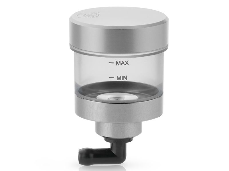 Depósito fluidos Rizoma CT145A Pure Plata. Realizado en un bloque de aluminio único y mecanizado mediante CNC, garantiza la máxima fiabilidad y precisión. El depósito de fluidos Rizoma CT145A Pure se presenta en diferentes formatos para diferentes aplicaciones y ofrece una amplia gama de colores (plata, negro, oro, rojo y bronce). Su diseño único incluye un vidrio estético y funcional totalmente transparente que permite ver la cantidad de fluido disponible.