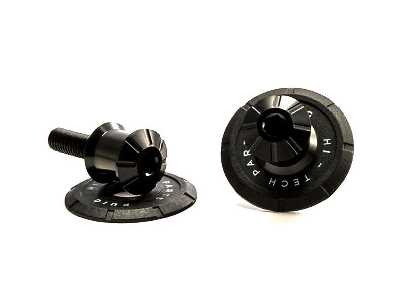 Diábolos caballete Puig 9259N Pro Negro. Nuevos diábolos para el caballete Puig 9259 Pro realizados en aluminio ergal mecanizado a partir de un bloque. Los diábolos Puig Pro se sirven con una arandela de nylon de color negro (con el grabado Puig Hi-Tech Parts) y que está diseñada para proteger el basculante de posibles rasguños. Colores disponibles: negro, rojo, azul, plata, oro. Precio del par. Métrica 8.