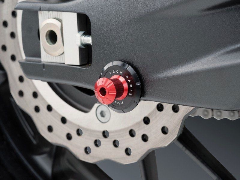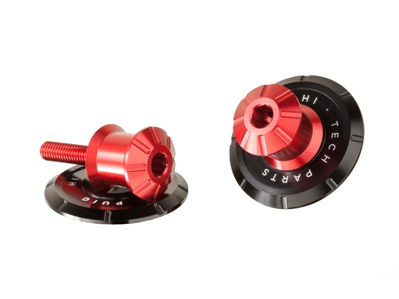 Diábolos caballete Puig 9260R Pro Rojo. Nuevos diábolos para el caballete Puig Pro realizados en aluminio ergal mecanizado a partir de un bloque. Los diábolos Puig Pro se sirven con una arandela de nylon de color negro (con el grabado Puig Hi-Tech Parts) y que está diseñada para proteger el basculante de posibles rasguños. Colores disponibles: negro, rojo, azul, plata, oro. Precio del par. Métrica 10 x 1,25.