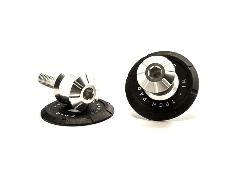 Diábolos caballete Puig 9261P Pro Plata. Nuevos diábolos para el caballete Puig 9261 Pro realizados en aluminio ergal mecanizado a partir de un bloque. Los diábolos Puig Pro se sirven con una arandela de nylon de color negro (con el grabado Puig Hi-Tech Parts) y que está diseñada para proteger el basculante de posibles rasguños. Colores disponibles: negro, rojo, azul, plata, oro y verde. Precio del par. Métrica 10X1.50.
