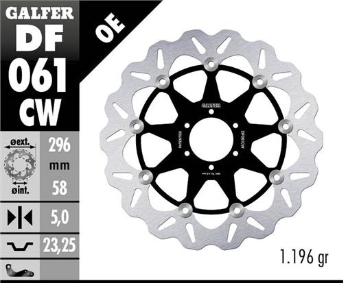 Disco de freno Galfer DF061CW Wave Flotante Completo Nucleo Aluminio 296mm. Descubre la máxima tecnología en sistemas de frenado con los discos de freno Galfer Wave Flotantes. Estos discos de freno están diseñados para ofrecer un rendimiento superior, combinando potencia de frenado y una excelente capacidad de disipación del calor, ideales para los motociclistas que exigen lo mejor en sus rutas.