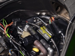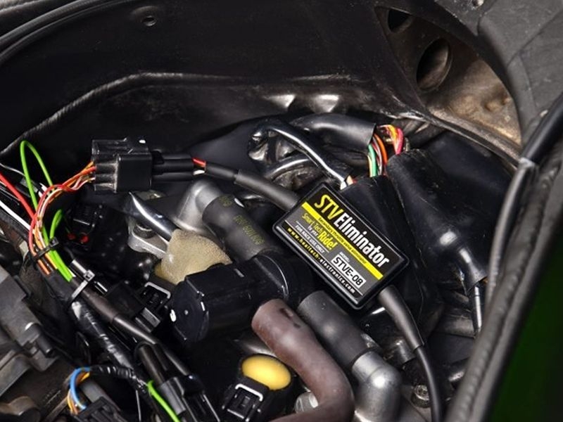 Emulador de la mariposa secundaria Healtech STVE-02. Es común quitar el actuador de la válvula de mariposa secundaria (STVA) en algunas motos Suzuki para aumentar el rendimiento o debido al fallo del servomotor. La ECU detecta la ausencia del servomotor e indica el error correspondiente en el cuadro. El emulador simplemente se conecta al conector STVA original para que la ECU no detecte la ausencia del STVA y así se quite la indicación del error. La imagen mostrada es genérica.