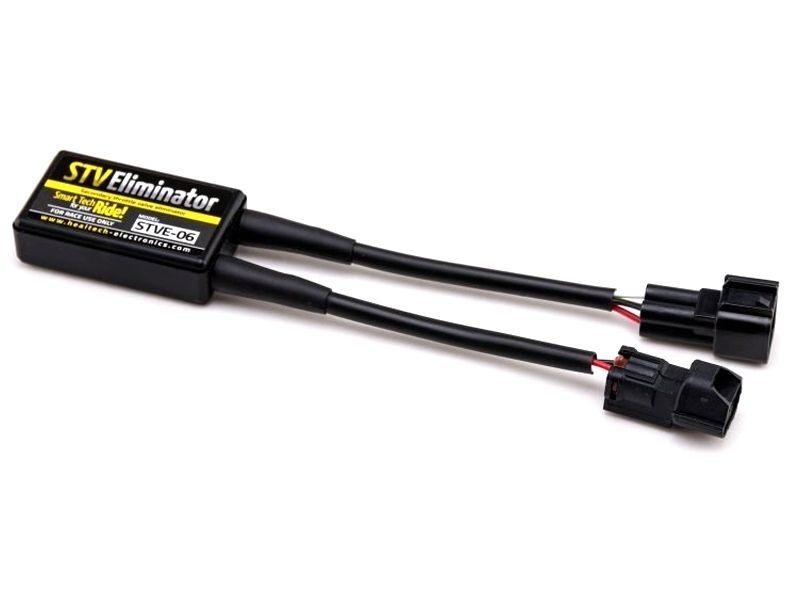 Emulador de la mariposa secundaria Healtech STVE-14. Es común quitar el actuador de la válvula de mariposa secundaria (STVA) en algunas motos Suzuki para aumentar el rendimiento o debido al fallo del servomotor. La ECU detecta la ausencia del servomotor e indica el error correspondiente en el cuadro. El emulador simplemente se conecta al conector STVA original para que la ECU no detecte la ausencia del STVA y así se quite la indicación del error. La imagen mostrada es genérica.