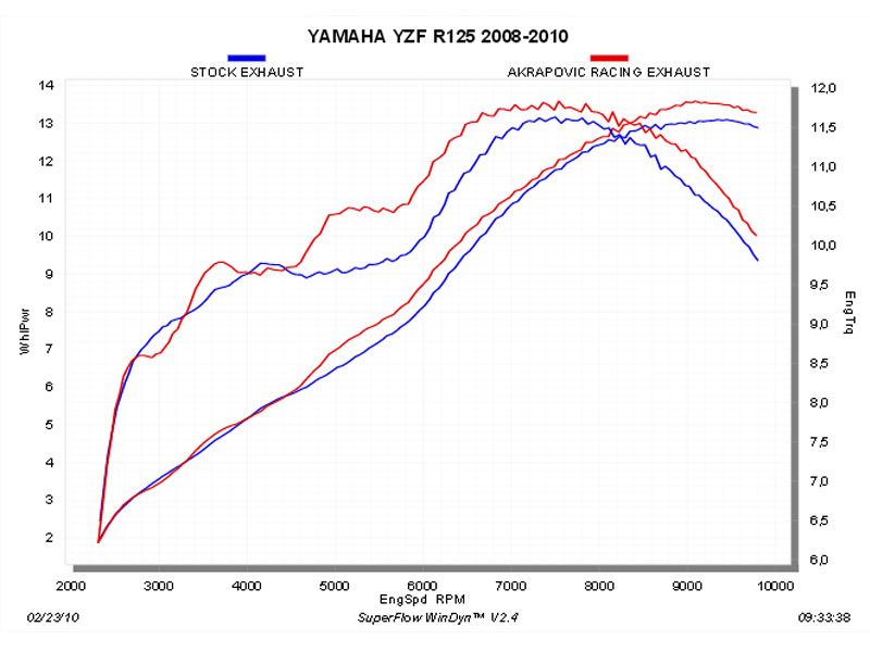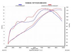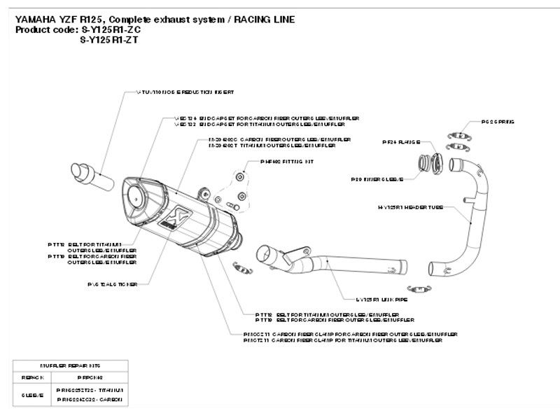 Escape completo Akrapovic S-Y125R1-ZC Modelo Racing Line Yamaha YZF 125 R 2008. Diseñado especialmente para cada modelo de moto, el escape completo Akrapovic S-Y125R1-ZC se caracteriza por el excelente rendimiento que ofrece en la moto y por su peso ligero. La versión de escape Racing Line posee los colectores en acero inoxidable. Este escape completo rebaja sustancialmente el peso total respecto al escape original. El escape completo Akrapovic S-Y125R1-ZC también aporta una notable mejora en cuanto a prestaciones de motor se refiere. El Slip-On está realizado en en fibra de carbono o titanio (según versión de escape) al igual que la copa final que también es de carbono.