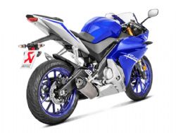 Escape Completo Akrapovic Racing Line S-Y125R4-HRT. Diseñado especialmente para cada modelo de moto, el escape completo Akrapovic S-Y125R4-HRT se caracteriza por el excelente rendimiento que ofrece en la moto y por su peso ligero. La versión de escape Racing Line posee los colectores en acero inoxidable. Este escape completo rebaja sustancialmente el peso total respecto al escape original. El escape completo Akrapovic S-Y125R4-HRT también aporta una notable mejora en cuanto a prestaciones de motor se refiere. El Slip-On está realizado en en fibra de carbono o titanio (según versión de escape) al igual que la copa final que también es de carbono.