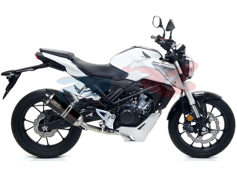 Silencioso escape Arrow 51516AKN Honda CB125 R 2018 Street Thunder (Aluminio Dark copa carbono). El silencioso de escape Arrow 51516AKN Street Thunder se ha diseñado para la nueva generación de motocicletas con escapes pequeños y de posiciones extrañas. Arrow Street Thunder posee una mezcla de diseño y tecnología para ofrecer uno de los escapes más bonitos del mercado. (La información que facilita Ramirez Motoracing es orientativa y sujeta a la verificación en la web del fabricante). Para su montaje es necesario combinar con el colector Arrow 51016KZ o 51016MI.