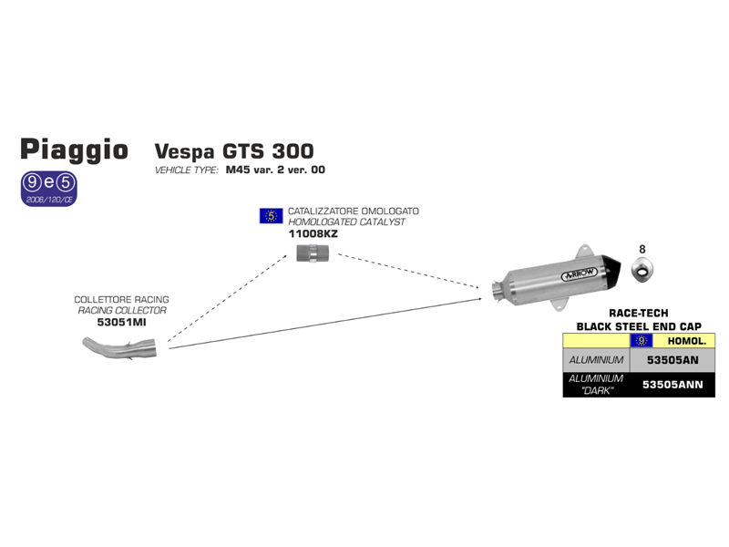 Silencioso escape Race-Tech Arrow 53505ANN Piaggio Vespa GTS 300 2008 / 2015 Aluminio Dark fondo Carbono. El slip-on escape Arrow Race-Tech 53505AN se caracteriza por su diseño en forma de diamante que garantiza una disminución del peso, sin afectar el volumen interno ni los niveles de ruído. Realizado interiormente en acero inox con la funda exterior en aluminio plata, cuenta con el terminal en aluminio dark y dB-killer extraíble.