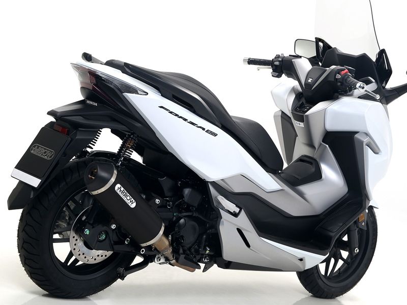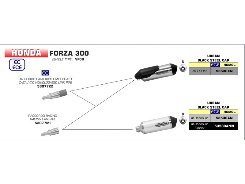 Silencioso escape Arrow 53530ANN Urban (aluminio Dark fondo Dark) Honda Forza 300 2018. Arrow Urban es el predecesor del Reflex 2.0 e introduce como novedades más destacadas, el escape racing corto en forma de diamante con catalizador opcional, interiores rediseñados y el terminal en color negro. El escape Arrow Urban está realizado en aluminio y gracias a su elaborado diseño, aporta unas prestaciones óptimas, un sustancial rebaja del peso y un sonido distintivo de Arrow. (La información que facilita Ramirez Motoracing es orientativa y sujeta a la verificación en la web del fabricante). Para su montaje es necesario combinar con el conector 53077KZ o 53077MI (venta por separado).