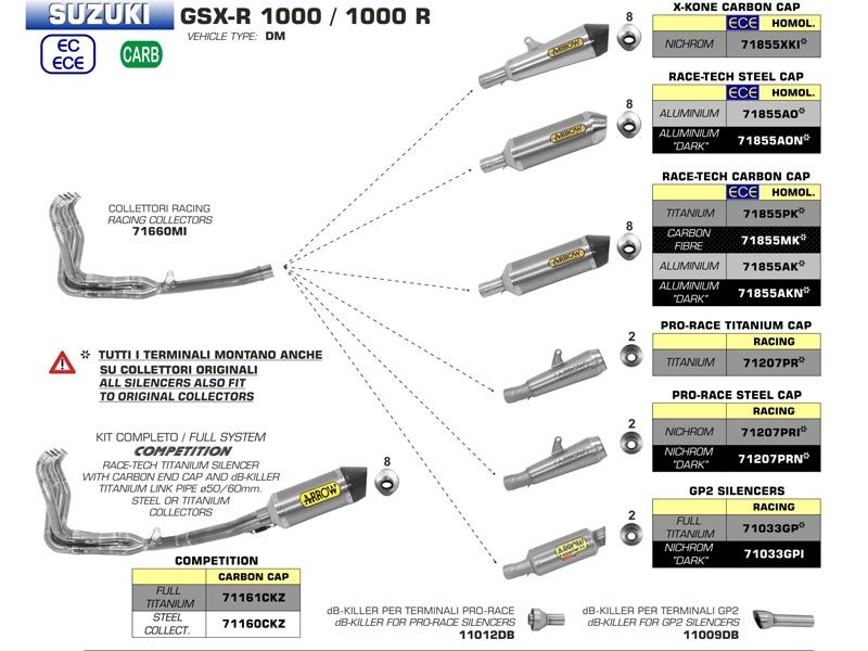 Debido a la complejidad de los productos Arrow, es muy importante verificar con la web del fabricante si es necesario o no el conector o colector para el montaje del silencioso. Debes saber que una línea continua en el esquema indica que este artículo es obligado. Por el contrario si la línea es discontinua, el montaje será opcional.