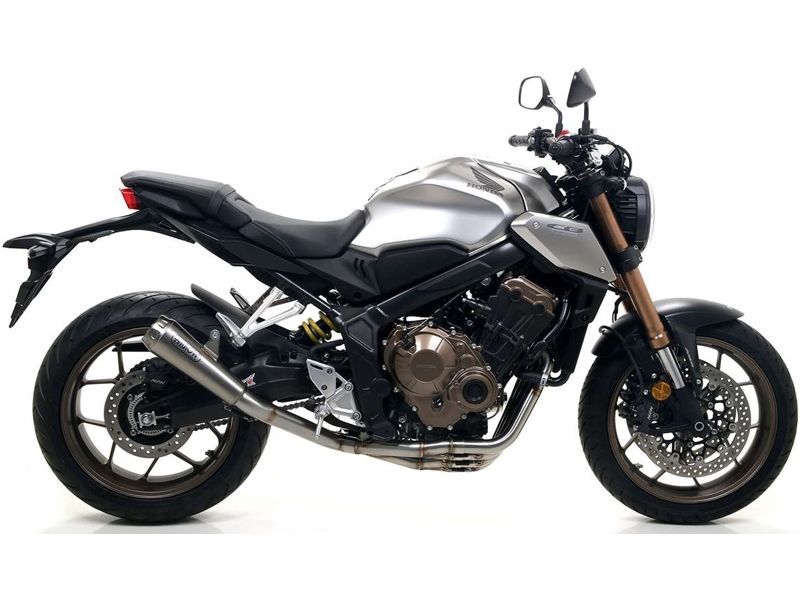 Silencioso escape Arrow 71217PR Honda CB 650 R 2019 Pro-Race (titanium). Slip-on Arrow 71217PR deriva directamente de los escapes de Moto Gp con forma de trompeta. Este silencioso no es posible adaptarlo a todos los modelos de moto debido al modelo del terminal y a que al tener poco volumen interno, se limita el mantener el nivel del ruido bajo control. Al tener forma de cono, el silencioso Arrow 71217PR se sujeta al marco con unos puntos de soldadura, por lo que no se puede emplear abrazaderas de carbono o acero inox como en los otros silenciosos.