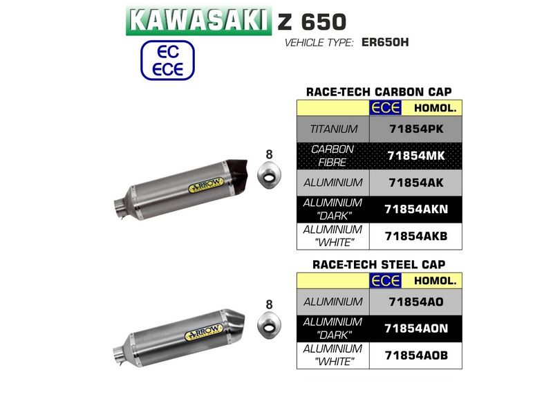 Escape Arrow 71854MK Race-Tech Kawasaki Z650 2017-2020. El silencioso Arrow Race-Tech 71854MK se caracteriza por su diseño en forma de diamante que garantiza una disminución del peso, sin afectar el volumen interno ni los niveles de ruído. Realizado interiormente en acero inox con la funda exterior en diferentes materiales (titanio, carbono o aluminio según modelo), cuenta con el terminal (copa final) en carbono y dB-killer extraíble. (La información que facilita Ramirez Motoracing es orientativa y sujeta a la verificación en la web del fabricante).