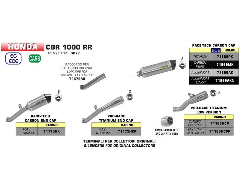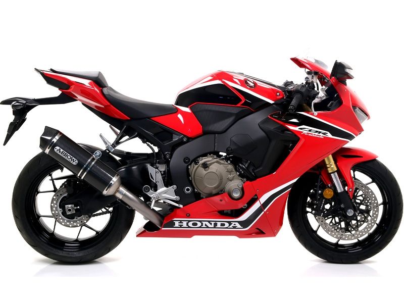 Escape Arrow 71869MK Race-Tech Honda CBR 1000 RR 2017-2019 (slip-on). El silencioso Arrow Race-Tech 71869MK se caracteriza por su diseño en forma de diamante que garantiza una disminución del peso, sin afectar el volumen interno ni los niveles de ruído. Realizado interiormente en acero inox con la funda exterior en diferentes materiales (titanio, carbono o aluminio según modelo), cuenta con el terminal (copa final) en carbono y dB-killer extraíble. (La información que facilita Ramirez Motoracing es orientativa y sujeta a la verificación en la web del fabricante).